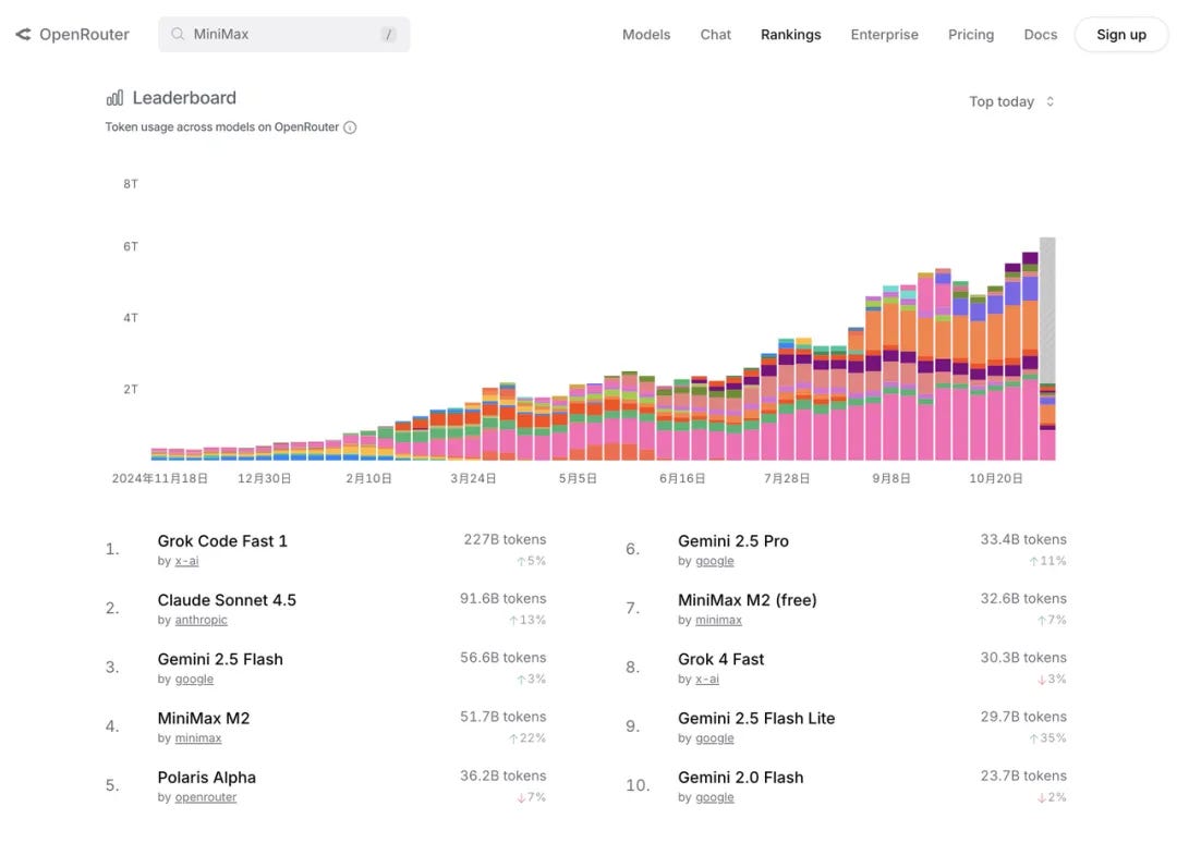 Let’s close with a detail: Song cites this interesting leaderboard from OpenRouter that shows strong performance from MiniMax’s M2 model (it ranks #4 in terms of token usage across models, based on a daily snapshot).